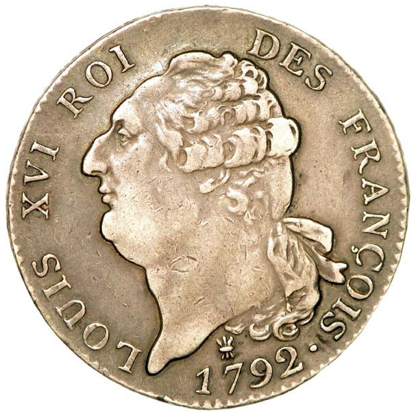 Photo of a coin sold by cgb.fr, link to the sale and their website: https://www.cgb.fr/louis-xvi-monarque-constitutionnel-ecu-dit-au-genie-legende-francois-1792-limoges-ttb-ttb,v46_0318,a.html.