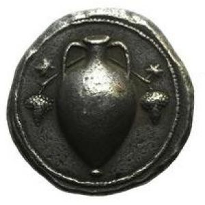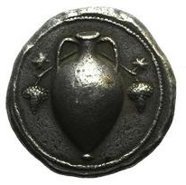 Amphore avec double poignée, lierre et grappe de raisin, carré incus quadripartie.