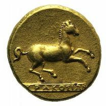 Cheval cabré à droite, inscription sous la ligne d'exergue.