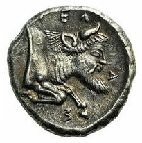 Un corps de taureau avec une tête d'homme vers la droite. CEΛAΣ inscrit en trois parties, au-dessus de sa tête: CEΛ, devant sa tête: A et en-dessous de ses pattes: Σ.