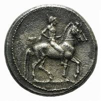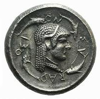Cavalier nu, tête d'Arethusa à droite avec quatre dauphins.