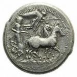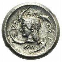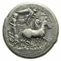 Quadrige à droite avec Nike couronnant les chevaux, tête d'Arethusa à gauche avec quatre dauphins.