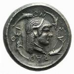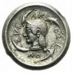 Tête d'Arethusa à gauche, portant un tainia. Quatre dauphins autour du portrait. Les lettres ΣVR devant le portrait, AK au-dessus de la tête, OΣΙ derrière et ON en-dessous.