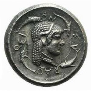 Tête d'Arethusa à droite, portant un tainia. Quatre dauphins autour du portrait. Les lettres ΣV devant le portrait, RAO en-dessous du portrait, OΣΙ derrière et ON au-dessus.