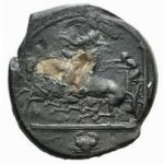 Un homme conduisant un quadrige courrant à gauche. Au-dessus, Nike volant, tenant une couronne et une plaque inscrite (EUAIN?). Un crabe en exergue.