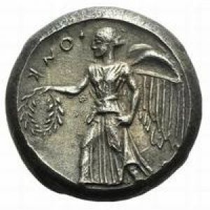Nike marchant à gauche et relevant sont vêtement de la main gauche. Elle tient également une couronne avec la main droite. Devant elle, une fin de légende.