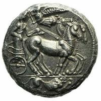 Un homme conduisant un trige courant vers la droite. Au-dessus, Niké volant et couronnant cet homme. Sous la ligne d'exergue, un lion.
