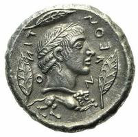 Tête laurée d'Apollon à droite, entourée de 3 feuilles. Sous le portrait, un lion.