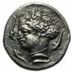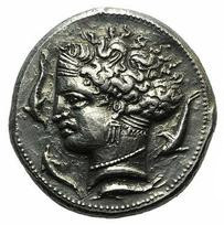Tête d'Arethusa à gauche, portant un collier de perles et une boucle d'oreille à trois pendants. Quatre dauphins entourant le portrait.