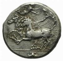 Personnage conduisant un bige courant vers la droite, au-dessus, une Niké volant et couronnant les chevaux. En-dessous du bige, Ketos.