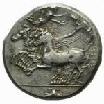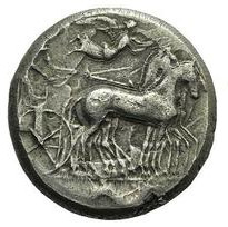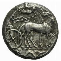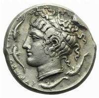 Bige vers la droite, tête d'Arethusa à droite, quatre dauphins autour du portrait, Ketos sous le bige.