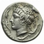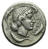 Bige à droite, tête d'Arethusa à gauche, quatre dauphins autour du portrait, Ketos sous le bige.