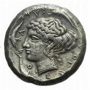 Tête d'Arethusa à gauche. Quatre dauphins autour du portrait. ΣYRAKOΣION devant le portrait.
