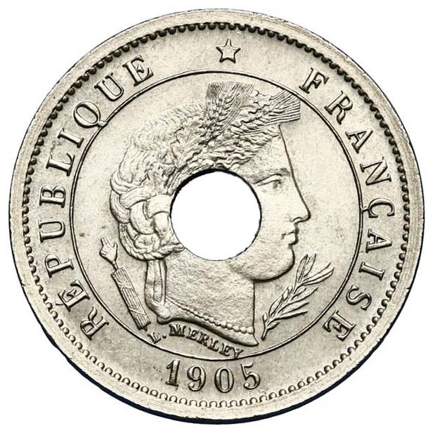 Photo d'une monnaie vendue par cgb.fr, lien vers la vente et leur site: https://www.cgb.fr/essai-de-5-centimes-merley-type-i-en-nickel-perfore-1905-paris-gem-12-6-sup62,fmd_426833,a.html.